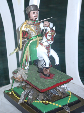 In the first years, the faithful conceived Santiago as a humble fisherman of Galilee, a companion of Christ. It was in 844, during the wars between the Christians and the Muslims, that the Spaniard's conception of Santiago changed. A legend tells of a battle where the Christians, fighting at a great disadvantage, were saved by Santiago who, dressed as a knight and riding a white horse, appeared in the Muslin camp and defeated the Moors. After that, the images and paintings of Santiago always depicted the saint as a Spanish knight, mounted on a white horse with a flag in his left hand and a sword in his right. From then on the Spaniards called on Santiago for help in time of war.